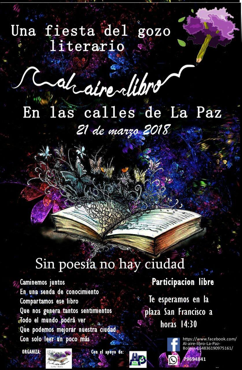 Por primera vez este 21 de marzo, La Paz vivirá la jornada mundial de Al Aire Libro, una iniciativa colombiana en conmemoración al día internacional de la poesía. Para esta IV versión se espera la participación de más de 270 ciudades del mundo. Para la ciudad maravilla, la cita es en la plaza San Francisco a hrs. 15:00.