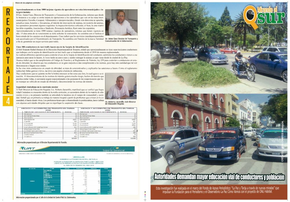 En el marco del Fondo de Apoyo Periodístico “La Paz y Tarija a través de nuevas miradas” que impulsa la Fundación Para el Periodismo y el Observatorio La Paz Cómo Vamos con el apoyo de ONU Hábitat, el periódico Nuevo Sur publicó el 22 de marzo de 2020 el reportaje: “Autoridades demandan mayor educación vial de conductores y población”.