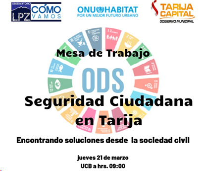 El Observatorio La Paz Cómo Vamos (OLPCV) de la ciudad de La Paz reunirá este 20 y 21 de marzo en la Universidad Católica Boliviana a autoridades del Gobierno Autónomo Municipal de Tarija (GAMT), vecinos, policía, instituciones y universidades para debatir sobre dos problemas que aquejan a la ciudad de Tarija y que fueron identificados por las autoridades municipales: seguridad ciudadana y asentamientos urbanos.