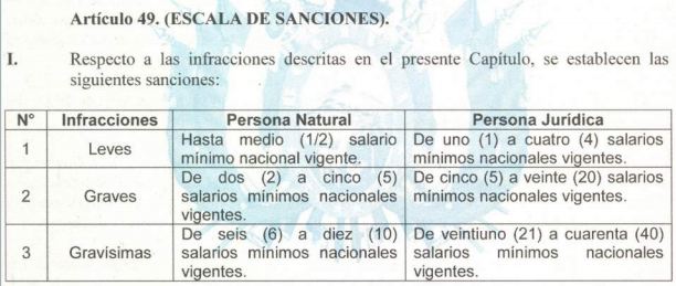 La Ley de Gestión Integral de Residuos promulgada el año 2015 por el Presidente Evo Morales establece en su artículo 44 que botar residuos en vía pública es infracción leve que conlleva una multa de hasta medio salario mínimo nacional vigente para persona natural o de 1 a 4 salarios mínimos nacionales vigentes para personas jurídicas