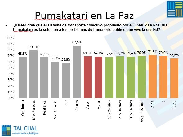 Según la opinión de la ciudadanía en la encuesta de percepción ciudadana 2017, el bus Puma Katari es la solución al problema del transporte público que aqueja la ciudad. Así lo confirma el 69.3% de personas que aprueban este servicio que cada año cuenta con mayor apoyo de la población, pues en 3 años incrementó su aceptación en un 8.7%.
