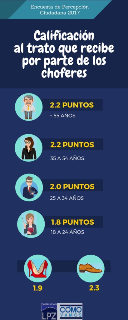 Como paceños sentimos que el trato que recibimos de los choferes que brindan servicio de transporte público en la ciudad no es bueno. Por ello, en la Encuesta de Percepción Ciudadana 2017 realizada por el Observatorio La Paz Cómo Vamos (OLPCV) la población calificó a este trato con un puntaje de 2.1 puntos sobre 5.