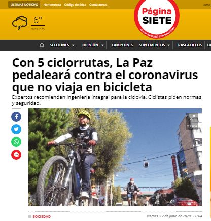 En el marco del Fondo de Apoyo Periodístico “La Paz y Tarija a través de nuevas miradas” que impulsa la Fundación Para el Periodismo y el Observatorio La Paz Cómo Vamos con el apoyo de ONU Hábitat, Página Siete publicó el 12 de junio de 2020 el reportaje: “Con 5 ciclorrutas, La Paz pedaleará contra el coronavirus que no viaja en bicicleta”.