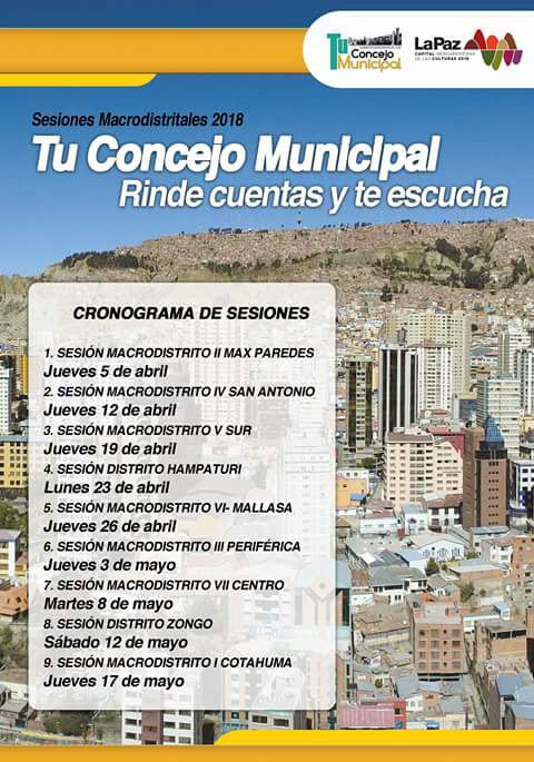 05/04.- Este  5 de abril, el Concejo Municipal de La Paz dará inicio a las sesiones macrodistritales. En el cronograma establecido, el Concejo Municipal -a la cabeza de Pedro Susz (presidente del Concejo) y el concejal asignado- cada semana visitará los diferentes macrodistritos para explicar los vecinos las actividades que el legislativo desarrolló, asimismo el concejal responsable emitirá el informe sobre sus actividades realizadas. Posteriormente, se habilitará un espacio para que la ciudadanía pueda exponer sus preocupaciones, reclamos y propuestas.