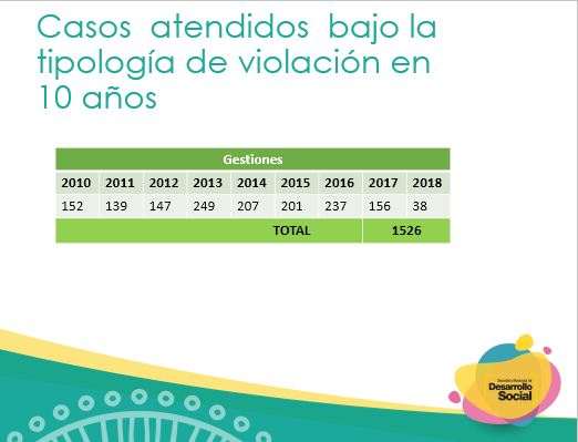 El año 2017, la Defensoría de la Niñez atendió 156 denuncias de violación y mediante la defensoría especializada en materia penal logró 38 sentencias sin derecho a indulto. Hasta abril de 2018, logró 10 sentencias. Además, gracias a las oportunas intervenciones se realizaron 19 acciones directas en flagrancia; es decir, en el momento en el que estaba siendo cometido el delito. El año pasado la suma total fue de 57.