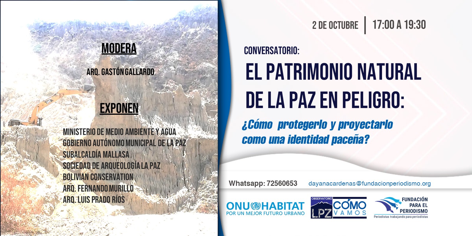 Preocupados por esta situación, el Observatorio La Paz Cómo Vamos, como parte del proyecto “Sistemas de responsabilidad pública para medir, monitorear e informar sobre políticas públicas sostenibles” y con el apoyo de ONU Hábitat invita al Conversatorio “El patrimonio natural de La Paz en peligro: Cómo protegerlo y proyectarlo como una identidad paceña”