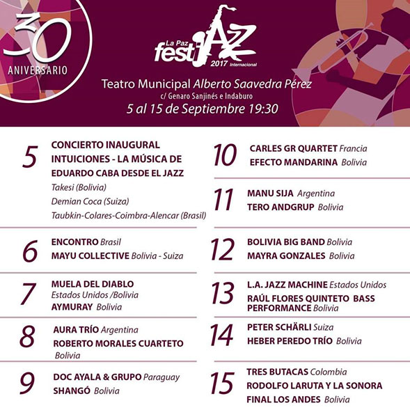 Desde el 5 de septiembre La Paz vivirá el trigésimo festival de jazz FETSTIJAZZ que se llevará a cabo en instalaciones del Teatro Municipal Alberto Saavedra Pérez. El concierto inaugural será ofrecido por un ensamble multinacional que realizará un homenaje al compositor boliviano Eduardo Caba, según informó uno de los organizadores del evento, Wálter Gómez. En el marco del Festijazz, se prevén presentaciones gratuitas en el Museo Nacional de Arte, y talleres con los invitados internacionales en la Universidad San Francisco de Asís.