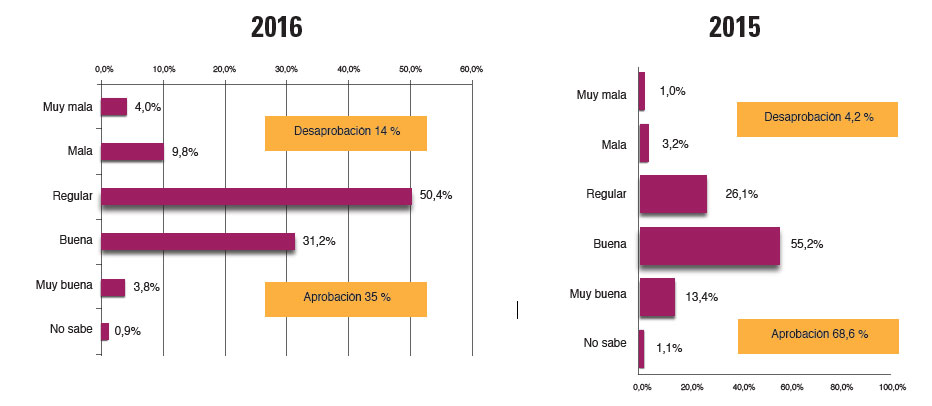 La evaluación de la gestión del alcalde Luis Revilla muestra un aumento de la desaprobación. Un 14% evalúa la gestión mala o muy mala (9.8 puntos porcentuales más que en el año 2015). Los encuestados que la evalúan “Regular” se multiplicaron al doble, así que en 2016 alcanzaron a un 50.4%. Mientras que la aprobación de la gestión del Alcalde cayó hasta la mitad de la registrada en 2015, así que ahora presenta un 35%.