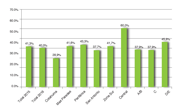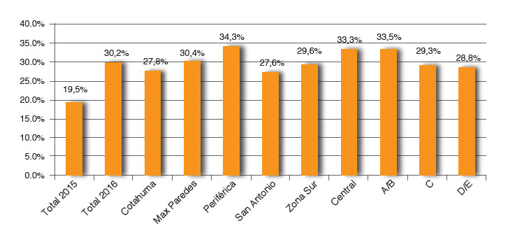 La última pregunta de esta parte de la encuesta fue “Si usted es de las personas que promueve y organiza un grupo en el barrio cuando aparece algún problema”. En 2015 sólo un 19.5% afirmó, pero en 2016 la proporción de las respuestas afirmativas aumentó a un 30.2%. La mayoría de la respuestas afirmativas vinieron de los encuestados de la Periférica (34.3%), el Centro (33.3%) y la clase más alta socioeconómica (33.5%). En ningún grupo entrevistado la proporción cayó debajo de un 27.6%.