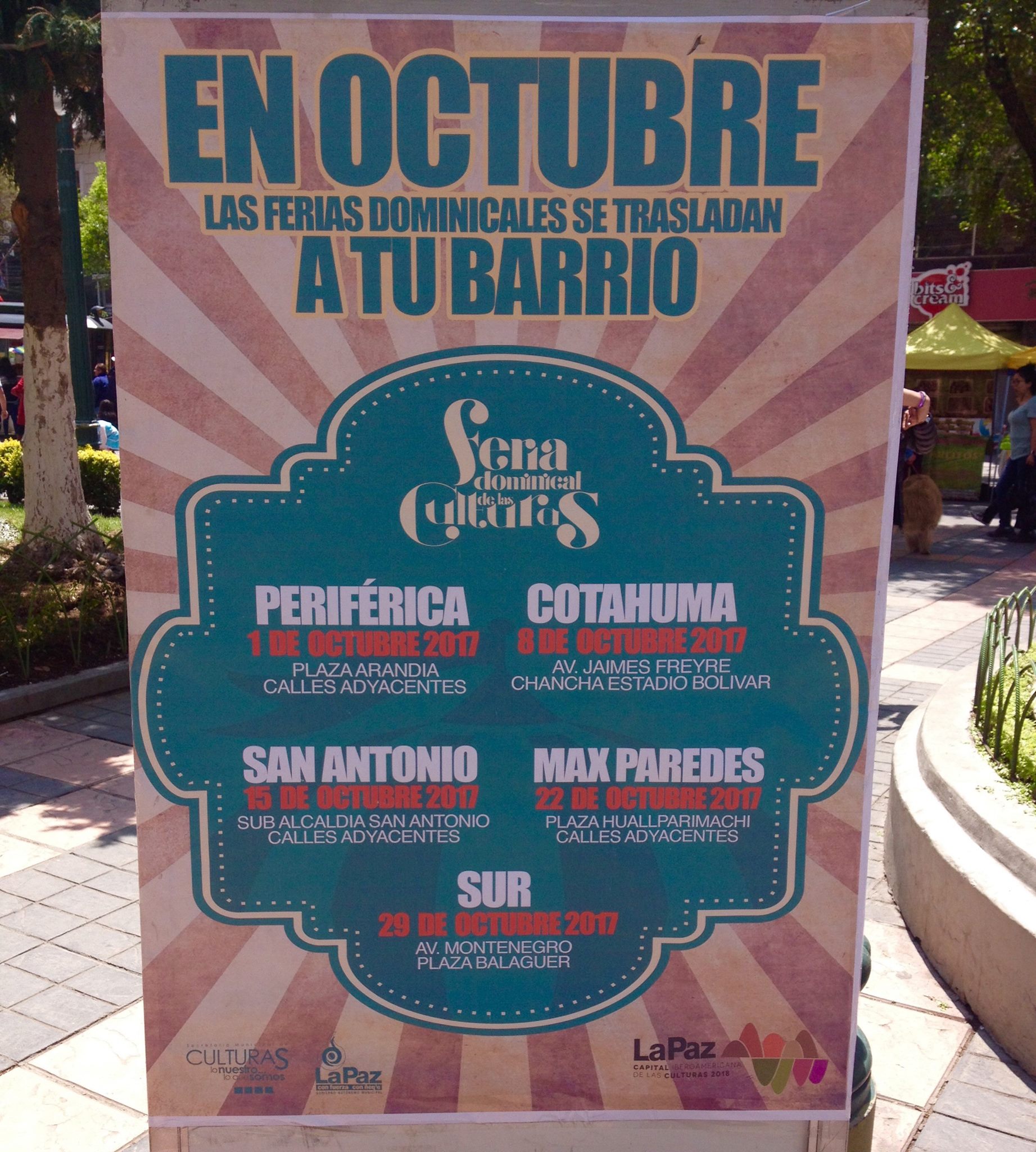 Desde octubre, la Feria Dominical de las Culturas se traslada a los diferentes Macrodistritos. La Plaza Arandia de Periférica será el escenario este 1ro de octubre. El 8 será el turno de Cotahuma, el 15 de San Antonio, el 22 de Max Paredes. y finalizará el 29 de octubre en la zona sur.