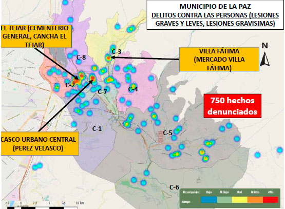 Estos “mapas de color” mostraron una localización detallada de los lugares donde se suscitaron más delitos. “Cerca del cementerio general se han registrado más delitos contra las personas, mientras los “hotspots” de robos estaban ubicados en el Prado, en el Pérez Velasco, en la Calle Sagárnaga, en Cota Cota y alrededor del Mercado Villa Fátima; más hurtos sucedieron en Cotahuma, en el Prado, en la Plaza Eguino y en la Avenida Mariscal Santa Cruz”, explicó Vargas, quien de la misma manera dio a conocer que de los 3451 hechos denunciados de violencia familiar o doméstica, la gran mayoría fue registrado en el norte de la ciudad, es decir en los cuadrantes 2, 3, 4, 7 y 8.