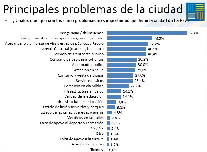 Entre los resultados de la Encuesta de Percepción Ciudadana realizada cada gestión por el Observatorio La Paz Cómo Vamos se evidencia que la inseguridad ciudadana y delincuencia (82,4%), el ordenamiento del transporte en general (46,5%), el aseo urbano o limpieza de vías y espacios públicos (42,2%), las convulsiones sociales (40,5%) y el servicio de transporte público (40,4%) son los cinco problemas más evidentes en la ciudad de La Paz.