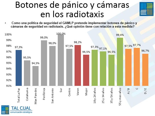 Consultados los ciudadanos sobre la instalación de cámaras de seguridad y botones de pánico en radiotaxis que fue anunciada a mediados del año en curso, un 97,3% de los encuestados aprueba la medida. La zona sur es el sector que muestra un 100% de aprobación, seguido de Periférica con un 99%. Asimismo, las personas mayores de 55 años son las que muestran mayor aceptación a la propuesta (99.4 %) y el sexo masculino en un 98.2 % en comparación al 96.5% de mujeres.