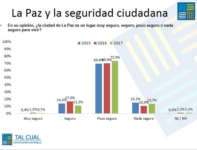 Un 73,3% de personas considera que la ciudad de La Paz es un lugar poco seguro para vivir y un 13,7% cree que es nada segura. La percepción de que la ciudad se está convirtiendo en un lugar poco o nada seguro para vivir aumentó con relación al año pasado (69,9% y 10,9% respetivamente).