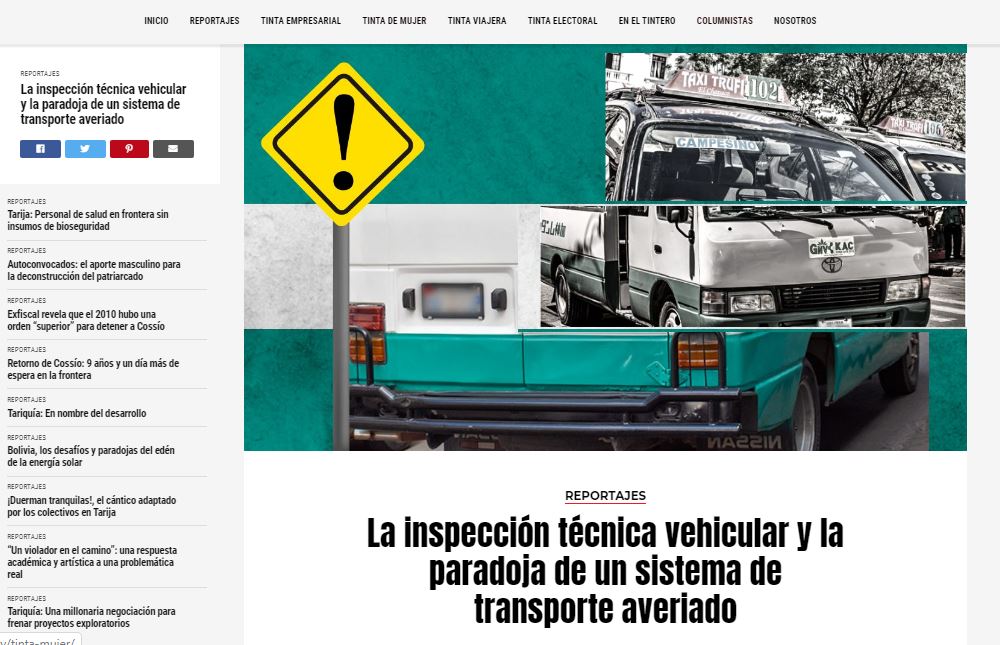 En el marco del Fondo de Apoyo Periodístico “La Paz y Tarija a través de nuevas miradas” que impulsa la Fundación Para el Periodismo y el Observatorio La Paz Cómo Vamos con el apoyo de ONU Hábitat, el periódico digital Verdad con Tinta publicó el 21 de marzo de 2020 el reportaje: “La inspección técnica vehicular y la paradoja de un sistema de transporte averiado”.