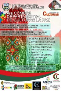6 mesas temáticas serán trabajadas en la Cumbre Departamental de Culturas este viernes 3 en el Salón Tupak Katari del Gobierno Autónomo Departamental de La Paz, y el sábado 4 de noviembre en el Teatro al Aire Libre. La convocatoria está abierta para artistas, productores, gestores, fundaciones y colectivos culturales  Mayores informes al teléfono 2200910
