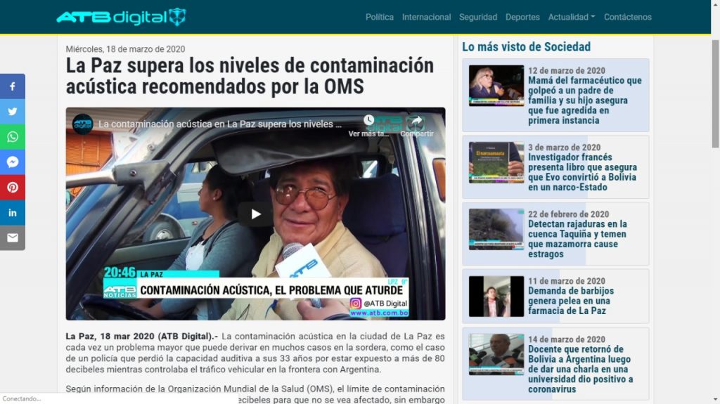 En el marco del Fondo de Apoyo Periodístico “La Paz y Tarija a través de nuevas miradas” que impulsa la Fundación Para el Periodismo y el Observatorio La Paz Cómo Vamos con el apoyo de ONU Hábitat, el canal ATB difundió el 19 de marzo de 2020 el reportaje: “La Paz supera los niveles de contaminación acústica recomendados por la OMS”.