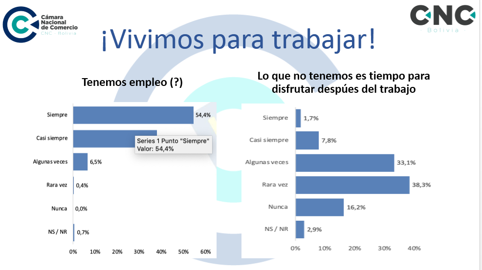 Otro de las datos que llamó la atención del público asistente fue la percepción de que el paceño “vive para trabajar”, pues los resultados demostraron que el grupo poblacional entre los 25 y 54 años (activos laboralmente) no están satisfechos con el tiempo libre que tienen después del trabajo, por lo tanto no pueden disfrutarlo habitualmente.