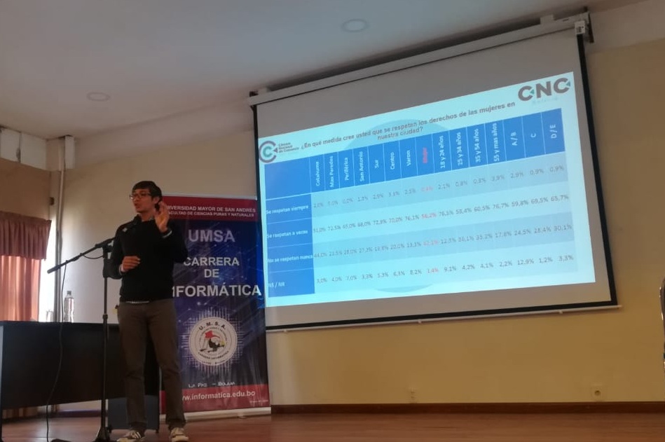 El pasado martes 3 de mayo, el Observatorio La Paz Cómo Vamos (OLPCV) expuso un análisis sobre los resultados de sus Encuestas de Percepción Ciudadana de los últimos 3 años a estudiantes de la carrera de Informática de la Universidad Mayor de San Andrés. La exposición estuvo a cargo del economista José Gabriel Espinoza de la Cámara Nacional de Comercio, institución miembro del OLPCV.