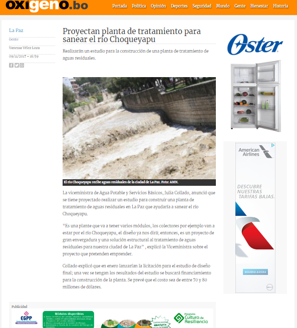 10/11/2017.- Como una solución estructural al tratamiento de aguas residuales de la ciudad de La Paz, se proyecta construir una planta de tratamiento que ayudaría a sanear el río Choqueyapu