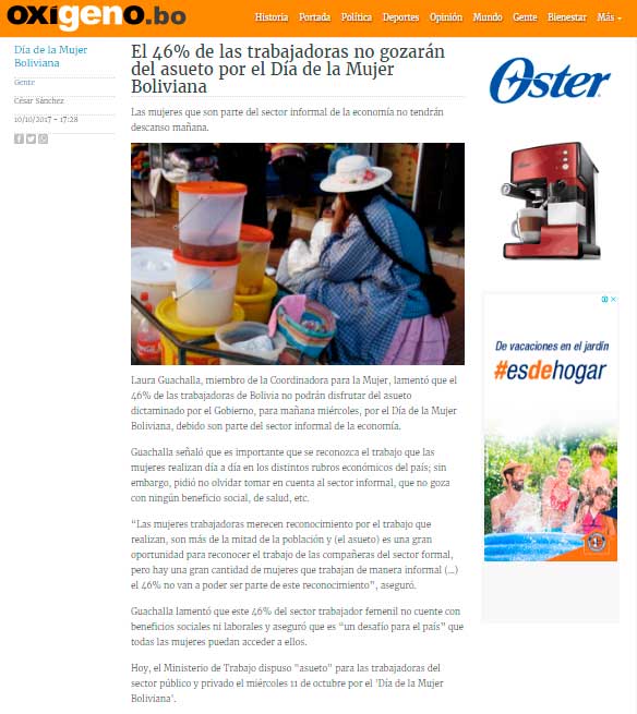 11/10/2017.-  46% de mujeres trabajadoras no gozarán del asueto establecido por el Ministerio del Trabajo en conmemoración al día de la mujer boliviana porque pertenecen al sector informal. La disposición establece asueto para las trabajadoras del sector público y privado.