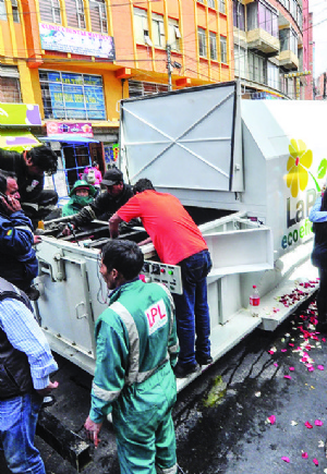 12/10/2017.- Ayer se realizó la entrega al mercado Lanza de un contenedor compactador que permite almacenar entre 10 a 12 toneladas de basura. Próximamente otros contenedores serán instalados en los mercados de Irpavi y Rodríguez.