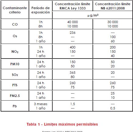 El parque automotor es el responsable del 70% de la contaminación atmosférica de la ciudad, según refieren estudios y artículos publicados en diversos medios de comunicación. Según el reglamento en Materia de Contaminación Atmosférica (RMCA), la Ley de Medio Ambiente 1333 y la Norma Boliviana 62011:2008 de IBNORCA, los límites máximos permisibles de los diferentes contaminantes son: