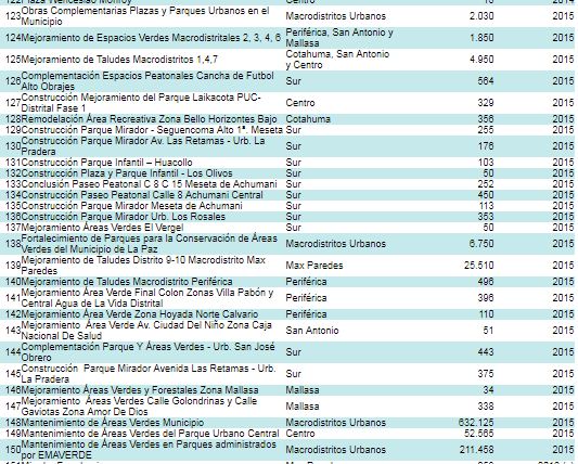 | Año | Cantidad de Áreas Verdes Construidas | Superficie de áreas verdes construidas | Áreas verdes mantenidas | Superficie de áreas verdes mantenidas | Inversión programada | Inversión Ejecutada |