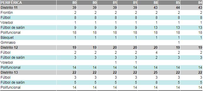 El municipio de La Paz cuenta con 396 campos deportivos de diferentes disciplinas. El macrodistrito de Periférica cuenta con 84 campos deportivos, lo que lo constituye en el macrodistrito con mayor cantidad de campos deportivos. De éstos, 46 son polifuncionales, 21 canchas de fútbol de salón, 13 de fútbol, 2 de frontón, 1 de volibol y 1 de basquetbol. Cotahuma es el segundo macrodistrito que cuenta con gran cantidad de escenarios deportivos (64) al contrario de Zongo que sólo tiene 6 escenarios deportivos: 3 de fútbol y 3 polifuncionales.