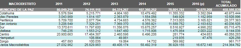 Fuente: Anuario Estadístico del Municipio de La Paz 2016. GAMLP