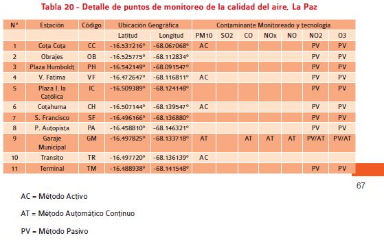 La red MoniCa realizó un monitoreo de la calidad de aire en la ciudad en 11 puntos específicos: Cota Cota, Obrajes, Plaza Humboldt, Villa Fátima, Plaza Isabel La Católica, Cotahuma, San Francisco, Plan Autopista, Garaje Municipal, Tránsito y la Terminal para analizar los contaminantes del aire a través de tres métodos: Método Activo, Automático Continuo y Pasivo.