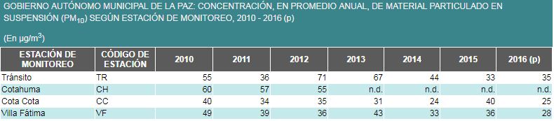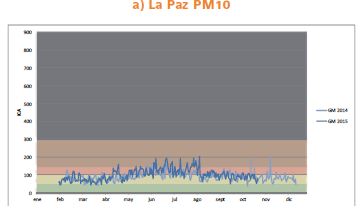 Se evidencia también que entre el año 2015 y 2016 existió una disminución de la concentración en promedio anual de PM10 en las zonas de Cota Cota y Villa Fátima