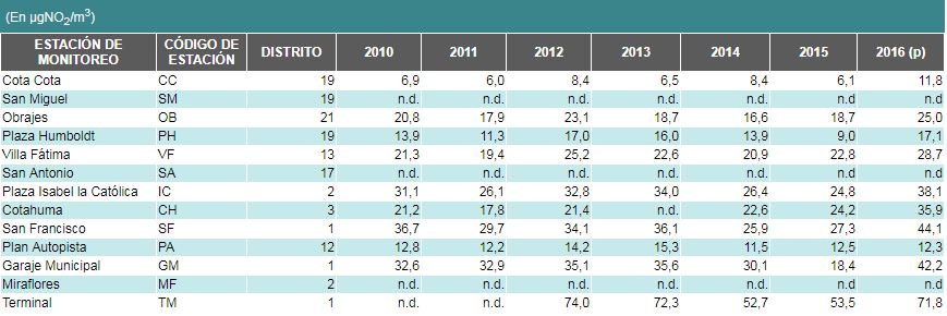 El límite de NO2 permitido es de 40 microgramos/metro cúbico. La comparación de promedios anuales realizada en diferentes gestiones mostró que los mayores niveles de concentración de NO2, que varían entre 30ug/m3 a 45 ug/m3, fueron encontrados en las Estaciones terminales, San Francisco, Garaje Municipal y Plaza Isabel La Católica, que fueron puntos referenciales de estudio. Por lo tanto, los mayores niveles de concentración de NO2 se encuentran cerca al centro de la ciudad, (Terminal, con 71,8, San Francisco con 44,1, el garaje municipal con 42,2) ya que es la zona que también registra mayor flujo vehicular