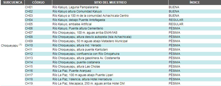 En diferentes puntos del río Choqueyapu (puente altura cementerio, industrias Venado, puente Kantutani, Costanerita, Las Cholas, puente Lipari y otros) se evidenció que la calidad del agua es pésima. Similar panorama está presente en el río Orkojahuira.