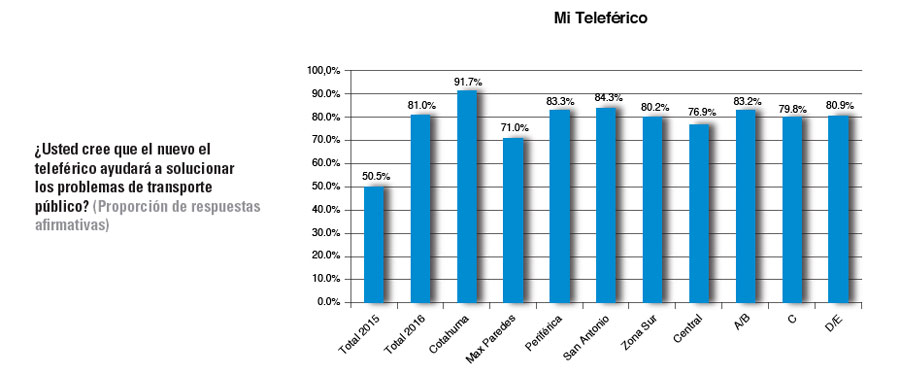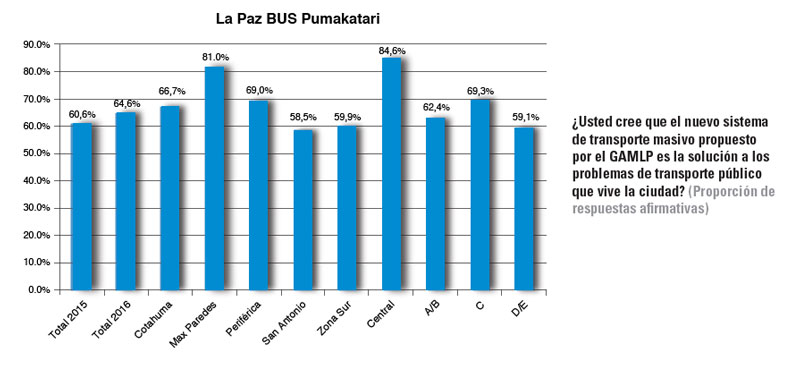Alguien podría alegar que eso se debe a los servicios de teleférico y bus municipal Puma Katari, positivamente identificados como soluciones al problema del transporte público (81% y 64%, respectivamente); sin embargo, la misma encuesta muestra que estos medios solo son empleados por el 12,3% ¿Usted cree que el nuevo sistema de transporte masivo propuesto por el GAMLP es la solución a los problemas de transporte público