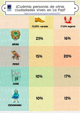Con referencia al sexo, el OLPCV destaca que son los varones, en su mayoría, quienes deciden radicar en la ciudad de La Paz (13.09%) en comparación al 17.61 % de mujeres que toman la misma decisión. De los varones, la mayor cifra (23%) revela que son orureños, en cambio un 20% de mujeres refirieron ser potosinas.