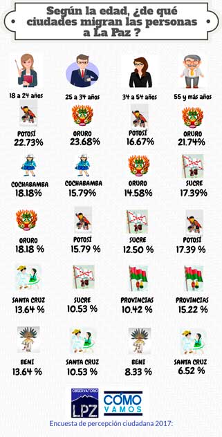 Las personas mayores de 35 que nacieron en provincias migran con mayor frecuencia a la ciudad que los jóvenes entre 18 y 35 años. Este dato fue revelado en la Encuesta de Percepción Ciudadana 2017 que llevó adelante el Observatorio La Paz Cómo Vamos (OLPCV).