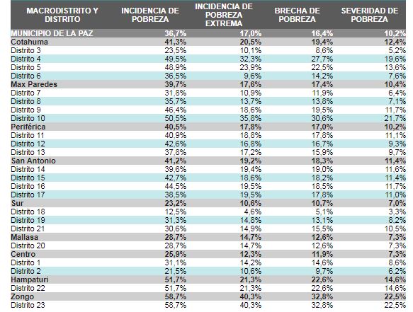 El municipio de La Paz tiene un índice GINI de 0.48. Zongo tiene el índice más elevado 0.58, seguido de Mallasa con 0.52. Al contrario, los macrodistritos con el índice GINI más bajo son Max Paredes, San Antonio con 0.43 y 0.45 respectivamente.