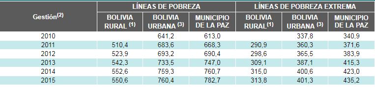 Los indicadores de pobreza por línea marcan que el año 2015, en el municipio de La Paz la línea de pobreza fluctuaba en los 782.7 bolivianos y la línea de pobreza extrema, 435.2 bolivianos.