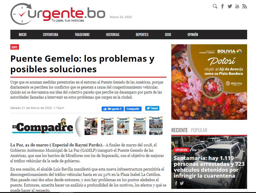 En el marco del Fondo de Apoyo Periodístico “La Paz y Tarija a través de nuevas miradas” que impulsa la Fundación Para el Periodismo y el Observatorio La Paz Cómo Vamos con el apoyo de ONU Hábitat, el periódico digital urgente.bo publicó el 22 de marzo de 2020 el reportaje: “Puente Gemelo: los problemas y las posibles soluciones”.