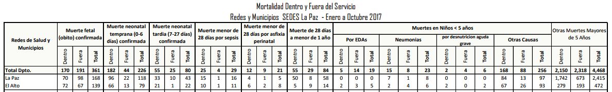 El año 2012 el municipio de La Paz registraba una tasa de mortalidad infantil en niños menores de 1 año de 20.4 por cada 1000 nacidos vivos. Hasta octubre del 2017 se registraron 168 fallecidos por muerte fetal, 118 por muerte neonatal temprana (0-6 días), 43 por muerte neonatal tardía (7-27 días), 16 por muerte menor de 28 días por sepsis, 5 por asfixia perinatal, y 58 muertes de bebés entre 28 días y un año.