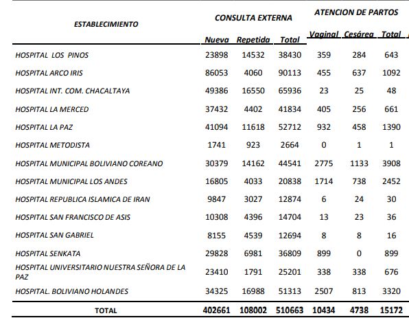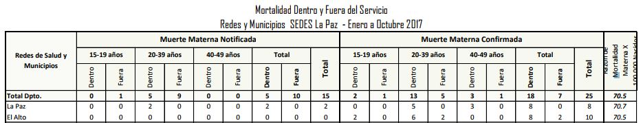 Sedes La Paz registró también 10 fallecimientos de mujeres, de los cuales 2 fueron notificadas y 8 confirmadas. Bajo ese total se afirma que la razón de mortalidad materna por cada 100.000 nacidos es de 70.7