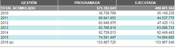 Las inversiones programadas y ejecutadas en el seguro básico de salud (SBS), el universal materno infantil (SUMI), el seguro de salud para el adulto mayor (SSPAM) y las prestaciones de servicios de salud integral (PSSI) alcanzaron el año 2016 la suma programada de 133.867.725 Bs de los cuales fueron ejecutados 133.867.540 . El monto destinado casi dobla a la cifra programada la gestión 2015. La atención de la red SEMA 165 para el seguro SUMI fue para 650 casos y 3.953 casos correspondientes al seguro de salud para el adulto mayor.