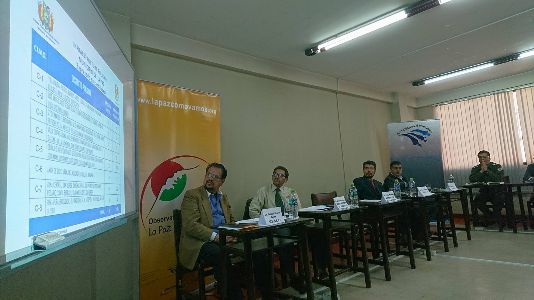 Con el objetivo de compartir datos de las investigaciones realizadas sobre seguridad ciudadana, el Observatorio La Paz Cómo Vamos reunió a representantes del Viceministerio de Seguridad Ciudadana, del Observatorio Nacional de Seguridad Ciudadana, del Gobierno Autónomo Municipal de La Paz y del Observatorio Municipal de Seguridad Ciudadana en la mesa redonda denominada ¿Seguridad Ciudadana en la ciudad de La Paz?