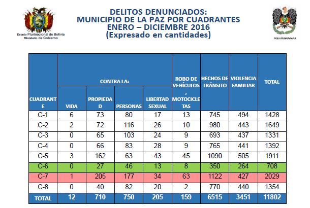 En el municipio de La Paz se realizaron 11.802 denuncias por algún tipo de delito; sin embargo, a pesar de esta cifra, el municipio se encuentra por debajo del promedio de casos de registrados de inseguridad ciudadana en el país.