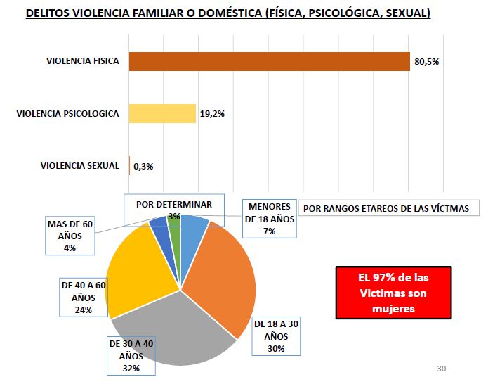 De todos los casos de violencia familiar (denunciados o no denunciados), un 80.5 % corresponde a la violencia física, 19.2% a la violencia psicológica y el 0.3 % a la sexual. En todos los casos, el 97% de las víctimas son mujeres entre 30 y 40 años.