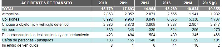 El año 2015 se registraron 10.355 accidentes de tránsito, entre atropellos, colisiones, choques, vuelcos, embarrancamientos e incendios.