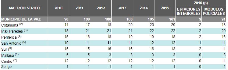 Para el año 2016 se contabilizaron 9 estaciones policiales y 91 módulos policiales haciendo un total de 100. En el macrodistrito Max Paredes se concentran 22 módulos.