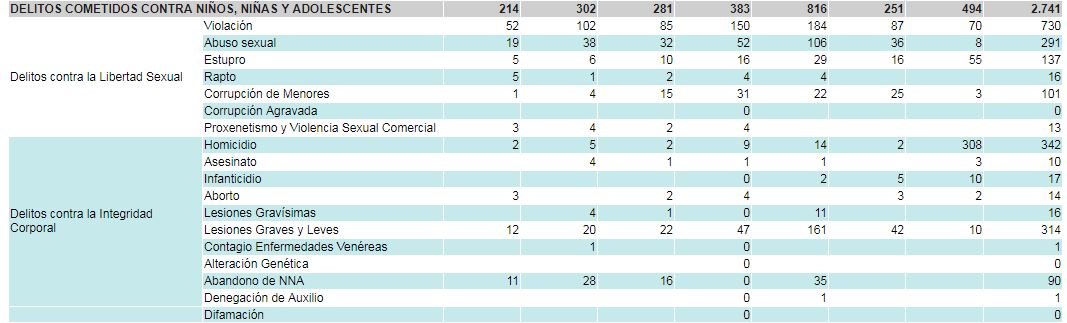 En el municipio de La Paz, el año 2016, se cometieron 494 delitos contra menores, cifra que dobla la registrada el año 2015 (251 casos). Del total de casos, se contabilizaron 308 homicidios, 70 violaciones y 55 casos de estupros