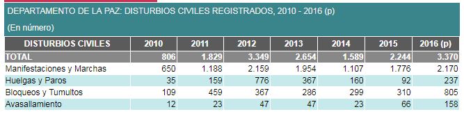 El año 2016 se registraron 3.370 disturbios recurrentes en el municipio de la Paz entre manifestaciones, marchas, bloqueos y tumultos, huelgas y paros y avasallamientos.